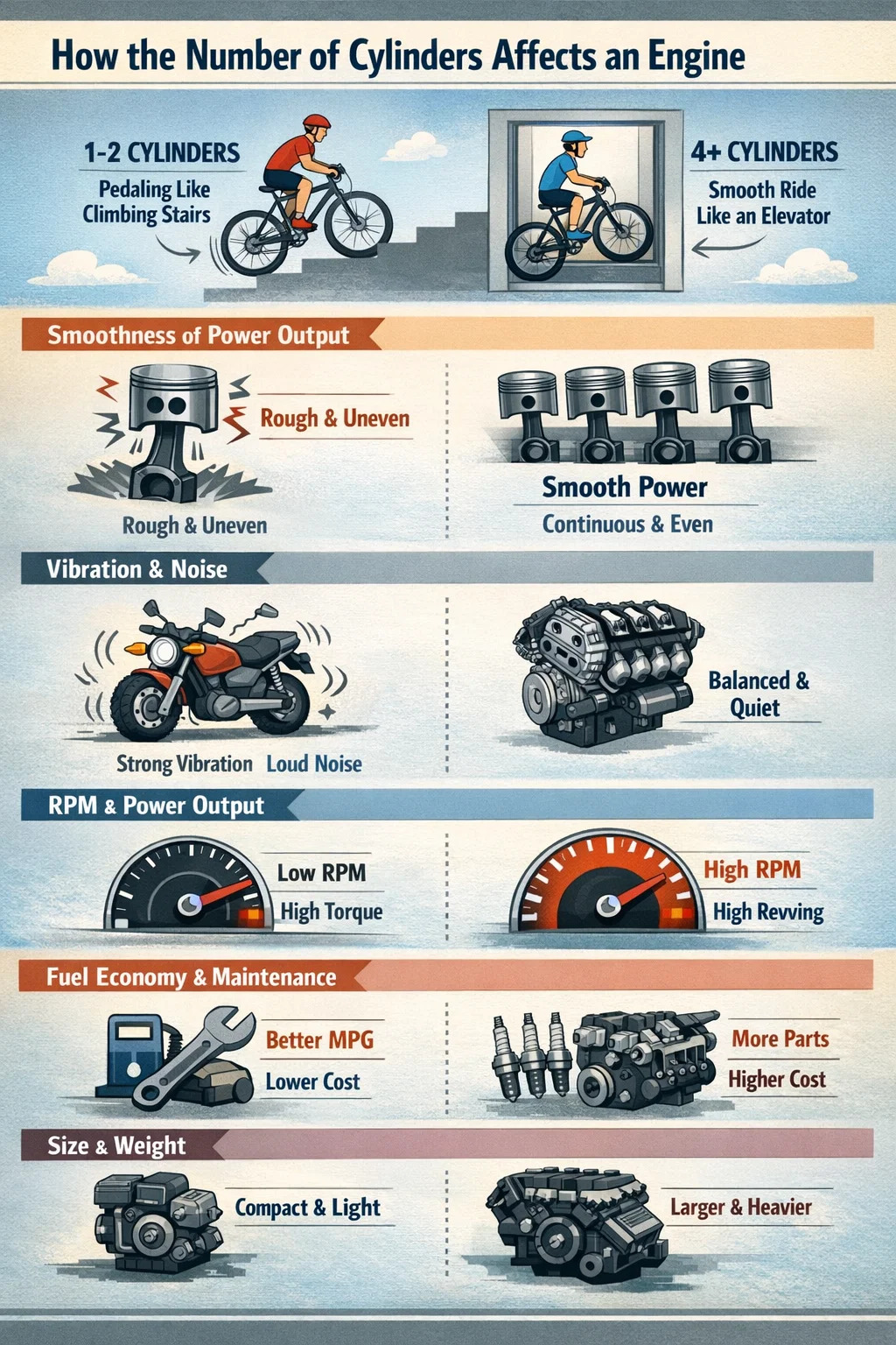 Lavt cylinderantal (1-2 cylindre): Det er ligesom at gå på trapper; du kan mærke en tydelig "pedalfornemmelse". Denne type motor har god effekt ved lave omdrejninger, men effektudtaget har en mærkbar pulserende fornemmelse og er ikke særlig kontinuerlig.