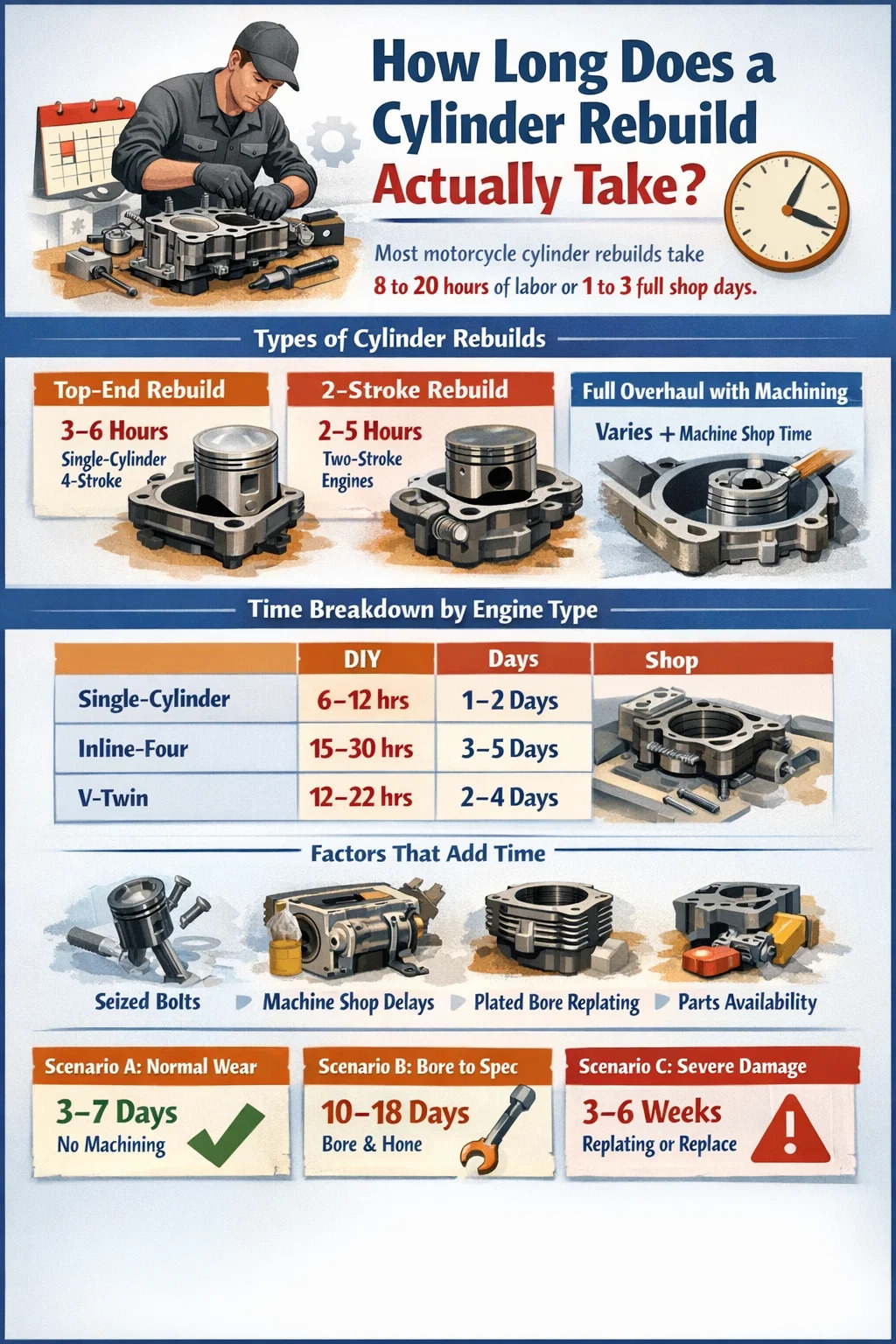 For de fleste motorcykel cylinder ombygninger, bør du planlægge efter 8 til 20 timers arbejde hvis du laver arbejdet selv, eller nogenlunde 1 til 3 hele butiksdage hvis jobbet overdrages til en professionel mekaniker. Dette område er bredt med vilje - den faktiske tid afhænger i høj grad af motortypen, cylinderens tilstand, om der er behov for maskinværkstedsarbejde og tilgængelighed af reservedele.