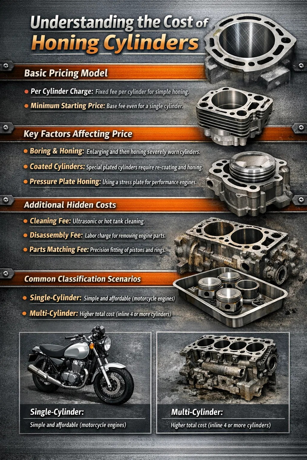 Opladet pr. cylinder: Dette er den mest almindelige model. Typisk vil butikken opkræve et fast gebyr pr. cylinder. Hvis du kun har brug for simpel "krydsskravering" (gendannelse af overflademønsteret for at hjælpe stempelringen tætning), er prisen pr. cylinder relativt lav.