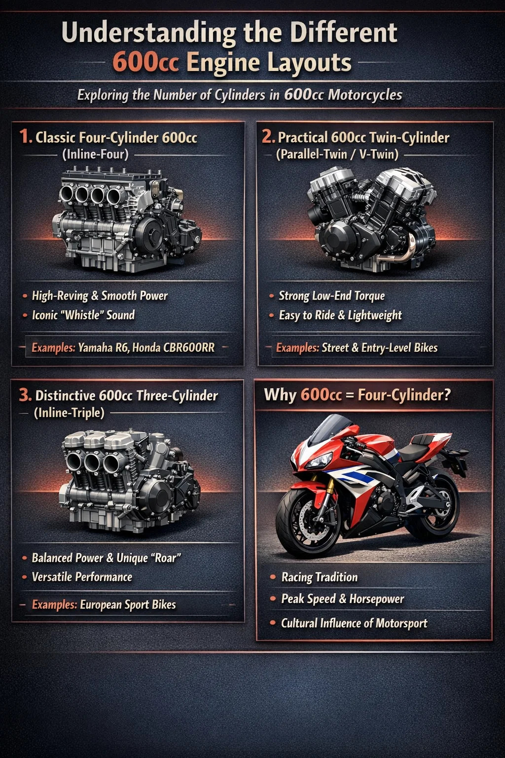 "600cc" repræsenterer motorens slagvolumen (det samlede volumen af alle cylindre), ligesom det samlede areal af et hus. Antallet af cylindre refererer til rummets indretning. Inden for 600cc slagvolumen er "rumdesignet" utroligt mangfoldigt.