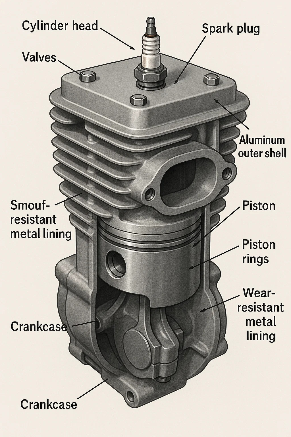 Har almindeligvis en ydre skal af aluminium (letvægtshurtig varmeafledning) med en slidstærk metalforing indeni (såsom en nikkel-siliciumbelægning eller jernforing) for at forhindre slid fra stemplet.