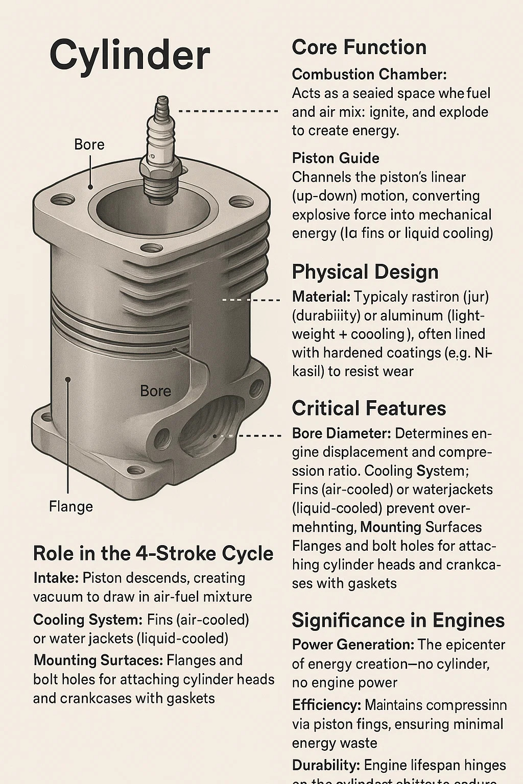 Materiale: Typisk støbejern (holdbarhed) eller aluminium (letvægtskøling), ofte foret med hærdede belægninger (f.eks. Nikasil) for at modstå slid.