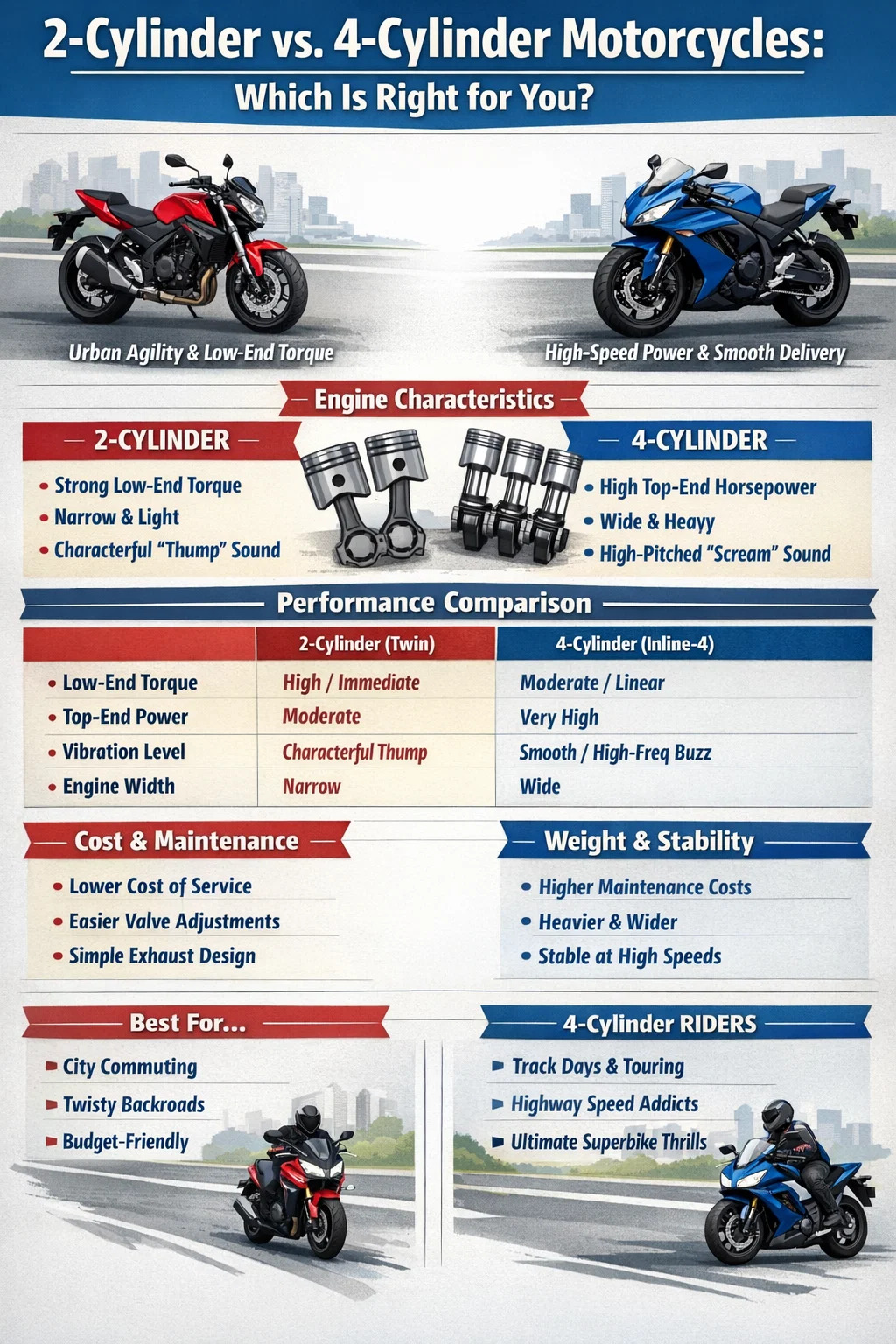 Den grundlæggende forskel ligger i, hvordan motoren ånder og bevæger sig. I en 2-cylindret opsætning (ofte en Parallel-Twin eller V-Twin), hver enkelt motorcykel cylinder er større. Større stempler har mere masse og en længere slaglængde, hvilket oversættes til et massivt slag af drejningsmoment ved lave omdrejninger. Dette "grynt" giver dig mulighed for at trække dig væk fra stoplys med autoritet uden at skulle danse på gearskifteren.
